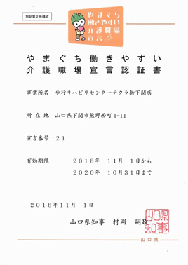 山口県内の介護サービス事業所が、就業環境の改善(人材育成やキャリアパス、定着・給与改善等)を通じて、「スタッフ(職員)一人ひとりが、やりがいを持って、働き続けられる職場づくりに向け、主体的に人材の確保・育成に取り組むこと」を宣言し、これからの進路を考える若者や、介護への就職を志す求職者の方等に情報発信する制度です。